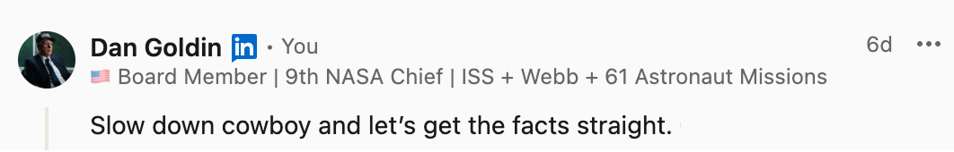 And one more from Babak Raeisinia (Cofounder, Machina Labs): “Folks forget that SpaceX and Blue Origin built and continue to build on the sound scientific and technological foundation put in place by NASA... dismissing NASA is failing to comprehend history and what it takes to achieve these feats.”